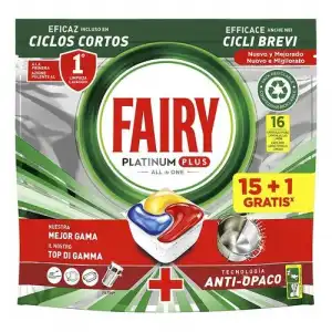 Fairy Platinum Plus All In One 15+1. Las mejores cápsulas de la colección de limpieza Fairy para eliminar restos difíciles y dejar la vajilla limpia y como nueva. Con acción de lavado rápido (eficaz en ciclos cortos, como todas las variedades de Fairy Platinum Plus) Limpia profundamente hasta el 99 % de los restos de comida visibles e invisibles gracias a su tecnología Deep Clean. El sistema de prelavado integrado lo hace por ti, para que ahorres agua.