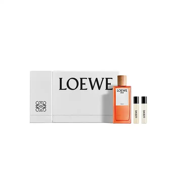 Descubre el irresistible Cofre Solo Ella Eau de Parfum de Loewe, una fragancia que celebra la feminidad con un toque de frescura y sofisticación. Este exclusivo estuche contiene un Eau de Parfum de 100 ml, un vial de viaje de 10 ml, y otro vial de 10 ml con el aroma complementario LOEWE Aire Sutileza EDT. Ideal para aquellas que buscan un regalo especial o un capricho personal.