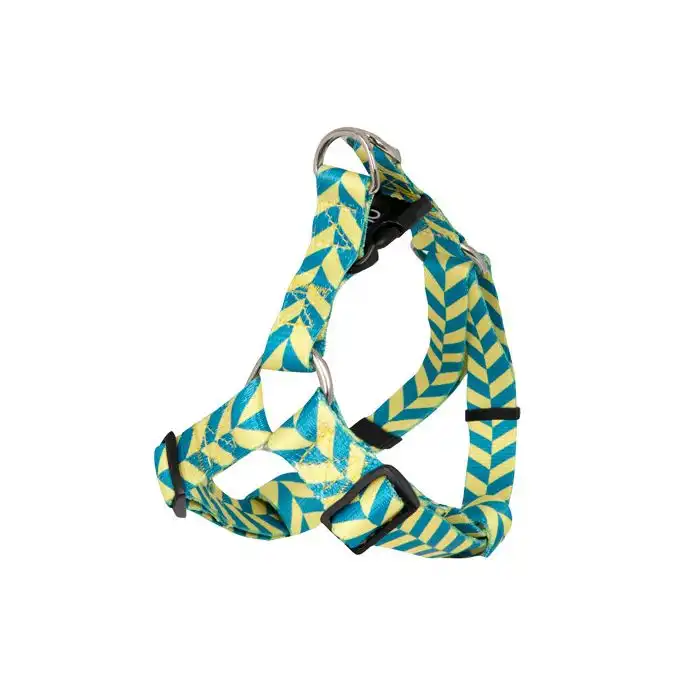 HU Arnés Stripes Amarillo y AzulEl arnés está fabricado con poliéster trenzado. El cierre superior de click de termoplástico POM es muy resistente y duradero. El arnés es muy fácil de poner y quitar gracias a su cierre. Las arandelas donde se engancha la correa y los puntos de sujeción son metálicos para una mayor resistencia.
