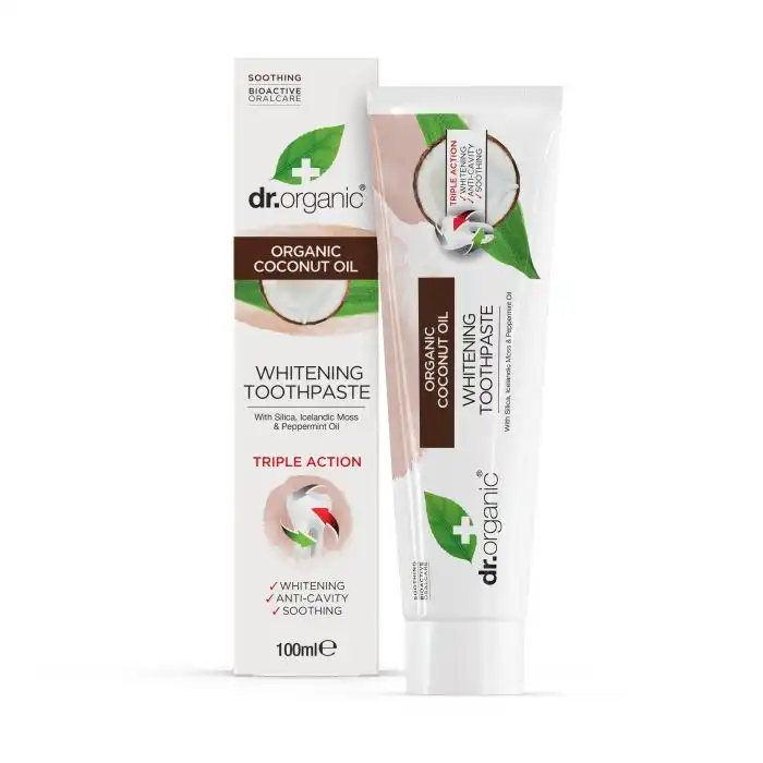 DR. ORGANIC Coconut Oil Pasta de Dientes BlanqueadoraDentífrico blanqueador triple acción, con coco. Esta fórmula blanqueadora exclusiva combina las propiedades nutritivas del aceite de coco con una mezcla compleja de extractos de plantas orgánicas y bioactivas.Una pasta de dientes única y exóticamente fresca puede calmar y reponer los dientes.Ayuda a dejar los dientes limpios y naturalmente blancos.