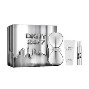 Estuche DKNY 24/7 Eau de Parfum 100 ml + 15 ml + Body Lotion 100 ml. Inspirado por el espíritu de la ciudad y las personas que encarnan esa fuerza de Nueva York. DKNY 24/7 es un homenaje a quienes viven la vida sin límites, siempre dispuestos, siempre en movimiento. La botella en forma de reloj de arena simboliza el flujo continuo del tiempo en la siempre activa ciudad de Nueva York.