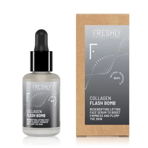 Freshly - Collagen Flash Bomb PTSérum de colágeno veganoRostro cansado, signos de fatiga, flacidez… Recárgalo de energía con este sérum de colágeno natural que reafirma, rellena y redensifica tu piel. Una fórmula natural a base de colágeno hidrolizado de obtención biotecnológica, vegano ¡y 100% idéntico al de tu piel! ¿Por qué este tratamiento facial tiene efecto dual? Porque aporta elasticidad y firmeza para un rostro visiblemente más saludable a largo plazo, y porque sus activos tensores tienen efecto flash en la primera aplicación. Puedes dormir 15 horas seguidas, ¡o puedes dar a tu rostro este chute de energía!Rellena líneas de expresión y suaviza arrugasPiel más elástica, firme y tersaCombate la piel apagada y fatigadaIncrementa la energía y renovación celularEfecto radiante con sensación de piel sedosaTratamiento facial ultraconcentrado de colágenoTextura sérum, fluida y de fácil absorción99.9% ingredientes de origen naturalColágeno natural vegano de obtención biotecnológicaPerfume natural. Afrutado con notas verdes y acuosas, un corazón de pera y melón, y una base dulce de vainilla.Envase de vidrioTestado dermatológicamenteApto para pieles sensiblesNo comedogénicoApto para embarazadas