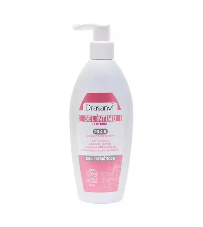 Gel Higiene Íntima ECOCERT BIO Drasanvi 300ml. Gel para la higiene de la zona íntima formulado a base de ingredientes ecológicos como el Aloe Vera, extracto de Caléndula, extracto de Olivo, aceite esencial de Árbol del Té, aceite esencial de Lavanda, aceite esencial de Geranio y extracto de Hamamelis. Limpia, calma e hidrata la piel, y además tiene acción antibacteriana y antifúngica. Su pH de 4.5 y su fórmula con prebióticos respetan la flora vaginal. Testado en pieles sensibles. Además cuenta con certificado ECOCERT.