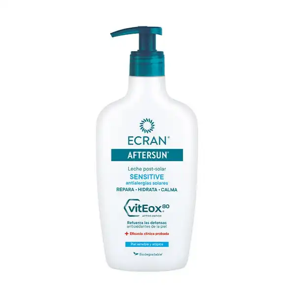 ECRAN AFTERSUN SENSITIVE leche antialergias solares. Corporales. Tipo de Piel: Sensible, Atópica. Texturas: Leche. Formulación: Hipoalergénico, Sin Parabenos, Sin Fragancia