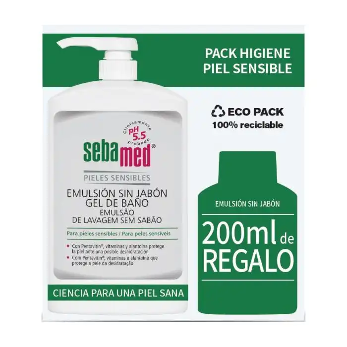 Gel de Baño, gracias a su PH 5.5 y al hecho de no contener jabón, está especialmente indicado para la higiene diaria de pieles sensibles y delicadas. Sebamed Emulsión Sin Jabón limpia sin agredir el manto ácido de la piel. Excelente tolerancia dérmica. Desodoriza biológicamente. Hipoalergénico.-nbsp;