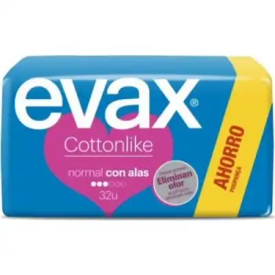 Pack de 32 unidades de compresas normal con alas Cottonlike de Evax. Ésta es la compresa con la que te sentirás más limpia, gracias a su exclusiva capa superior de tacto algodón cottonlike y a su núcleo súper absorbente que previene el olor. Las compresas con alas proporcionan una mayor sujeción y protección lateral de las braguitas. Ésta es la compresa idónea para los días de flujo normal.