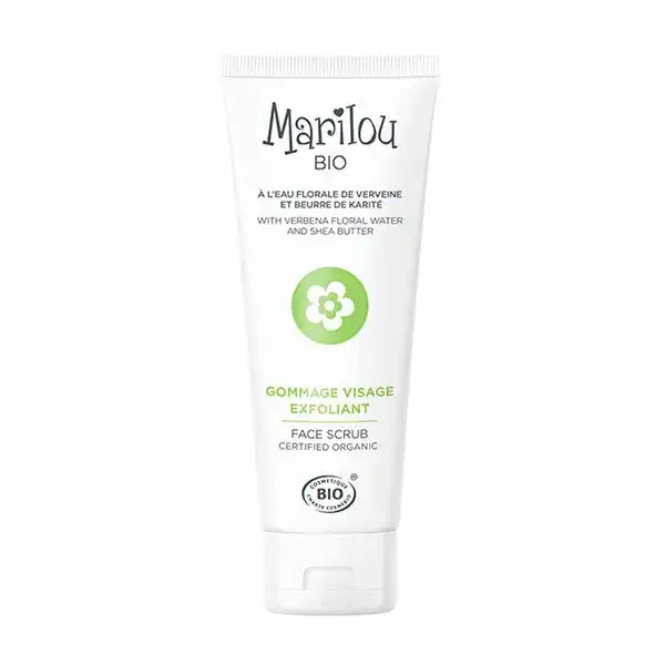 Este exfoliante facial orgánico muy suave de Marilou Bio ayuda a la piel a eliminar las células muertas, eliminar los puntos negros y regenerarse más fácilmente.Su fórmula contiene un extracto vigorizante de Verbena, aceite de sésamo con propiedades regeneradoras, manteca de karité reconocida por su poder nutritivo asà como granos exfoliantes muy ligeros de origen mineral para exfoliar suavemente la piel.Con una textura cremosa ultrasuave, se convertirá rápidamente en una parte esencial de su rutina facial para refinar la textura de tu piel y devolverle el brillo al cutis.BENEFICIOS Exfolia suavemente Ayuda a la piel a eliminar las células muertas. Ayuda a la piel a regenerarse Refina la textura de la piel Restaura el brillo