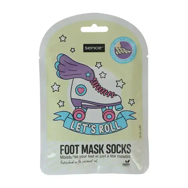 Aplica el cuidado de la piel de tus pies con una fresca mascarilla para pies Sence. Esta máscara para pies con estampado de patines hará que tus pies se sientan suaves e hidratados mientras te sientas e imaginas que patinas por las calles.