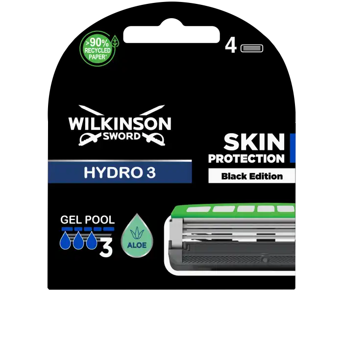 WILKINSON Hydro 3 Black Edition RecambiosEl depósito de gel* se activa al contacto con el agua y crea una barrera protectora para un afeitado más cómodo. * Hidrata en cada pasada. Con unas innovadoras barras protectoras incorporadas en sus hojas ultradeslizantes que suvizan la superficie de la piel, ayudando a que la piel no se enganche al afeitarse y así reducir la irritación. Para reducir la irritación y proporcionar un afeitado más cómodo.Testado Dermatologicamente