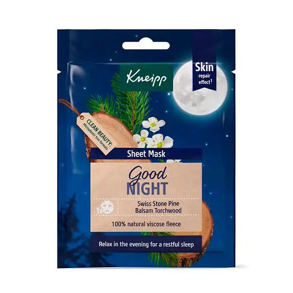 Disfruta tu momento Kneipp®. ¿Tu piel necesita un descanso? La mascarilla de tejido Good Night de Kneipp® le proporcionará un cuidado reparador a tu piel. Inhala profundamente, cierra los ojos y recuéstate. Disfruta de este momento de descanso.La mascarilla de tejido Kneipp® Good Night con extracto de pino suizo y amyris balsamÃfera cuida y nutre tu piel intensamente durante la noche. El efecto aromacológico de sus aceites esenciales ayuda a crear un momento de calma y relajación antes de acostarte. Un cuidado ideal como ritual antes de dormir, para lucir fresca y despierta por la mañana. Buenas noches â mejores mañanas! Nuestro tejido de viscosa 100% natural se ajusta perfectamente a tu cara como una segunda piel, sin descolocarse. A través del contacto directo con la piel, los ingredientes activos de la mascarilla penetran en la piel y proporcionan una experiencia de cuidado intensivo.Efecto reparador de la piel: favorece la regeneración natural de la piel durante la noche.⢠Con aceites de pino suizo y amyris balsamÃfera⢠Tejido de viscosa 100% natural y biodegradable⢠Formulado sin microplásticos⢠Vegano**Confirmado por un estudio cientÃfico*En este producto no se han añadido sustancias de origen animal.