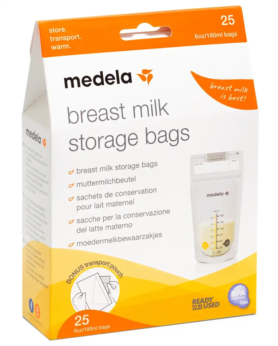 Medela 25 Bolsas para leche materna Medela Fáciles de usar e higiénicas, y son la manera más práctica de almacenar, transportar y calentar la leche materna extraída.Beneficios:Sistema de protección con autocierre doble para evitar fugas y doble pared.Las bolsas se pueden apoyar en vertical para una manipulación sencilla y en horizontal para un almacenamiento plano.