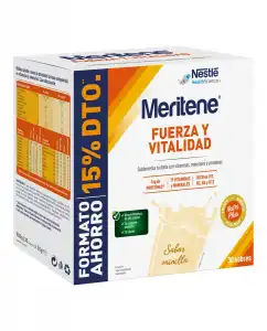 Meritene FUERZA Y VITALIDAD es una solución nutricional en formato polvo para diluir y obtener un delicioso batido. Su fórmula NutriPlus contiene proteínas, de alta calidad, y 19 vitaminas y minerales. Sus ingredientes permiten suplementar la dieta, contribuyen a disminuir el cansancio y la fatiga y al funcionamiento normal del sistema inmunitario. 1 - Personas con cansancio y falta de fuerzas. 2- Buscan un refuerzo en su alimentación porque tienen una menor ingesta o requerimientos nutricionales aumentados. 3 -Necesitan recuperarse en fases de convalecencia (proceso viral, intervención quirúrgica..) o reforzar su estado de salud. 4-Quieren suplementar su nutrición para seguir con su ritmo de vida activo. FUERZA: Con proteínas, de alta calidad, que contribuyen a aumentar y conservar la masa muscular. Con calcio y vitamina D, que contribuyen al mantenimiento de los huesos en condiciones normales. / VITALIDAD: Con magnesio y vitaminas B2, B6 y B12, que ayudan a reducir el cansancio y la fatiga. / SISTEMA INMUNITARIO: Con vitamina C, D, Zinc y Selenio que contribuyen al funcionamiento normal del sistema inmunitario. 30 Sobres de 30 gr. ¿CÓMO DEBO TOMARLO?>Se aconseja tomar los batidos entre horas con el objetivo de que sea un añadido a la dieta habitual.>1 o 2 batidos al día según las necesidades de cada persona.>Preparación Meritene Batido: verter 1 sobre en 200ml de leche semidesnatada fría o caliente y remover. También se puede preparar en agua u otras variedades de leche.**Los aportes totales macro y micronutrientes variarán en función de la variedad de líquido o leche elegida.Meritene FUERZA Y VITALIDAD recomienda seguir una dieta variaday equilibrada y realizar ejercicio físico. Este producto no debe sustituir las comidas principales. Para adultos.