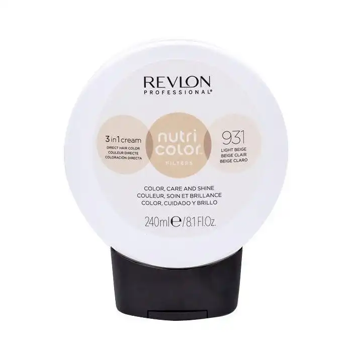 REVLON Professional - Nutri Color Filters 3 in 1 Cream No. 931 Light BeigeFiltro tonificante para refrescar: Brillo para tonos rubios clarosMejora el color mediante el cuidado: en un solo paso, los filtros Nutri Color de Revlon Professional aportan al cabello un color como un filtro, un cuidado intensivo y un brillo encantador. El secreto de las mascarillas de color directo reside en la innovadora tecnología Insta-Pic 3 en 1: mientras que los pigmentos iónicos se adhieren de forma óptima a la fibra capilar y garantizan resultados de color intensos que duran hasta 8-15 lavados, el pantenol proporciona al cabello Una valiosa humedad y un potente sistema acondicionador suavizan y sellan la fibra capilar para un brillo radiante. Las mascarillas de color de la familia Toning Filter, que se pueden mezclar libremente entre sí para creaciones de color individuales, refrescan el color del cabello y le dan intensidad: Toning Filter Light Beige, cuando se aplica puro, es ideal para restaurar los cabellos muy claros, descoloridos e incoloros. Tonos rubios con una dosis extra de brillo que el color arena para hacer brillar el rubio claro. Combinado con el Mixing Filter Clear, se crean hermosos efectos pastel y junto con el Mixing Filter Shadow o Blush, la fórmula lavable evoca toques empolvados.