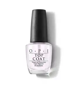 Top Coat de OPI, con el que conseguirás un acabado brillante y duradero. Este top coat está diseñado para aplicar después de tu esmalte habitual, haciendo que la manicura aguante perfecta durante mas tiempo. Se utiliza como paso final de la manicura, y aporta un acabado brillante.