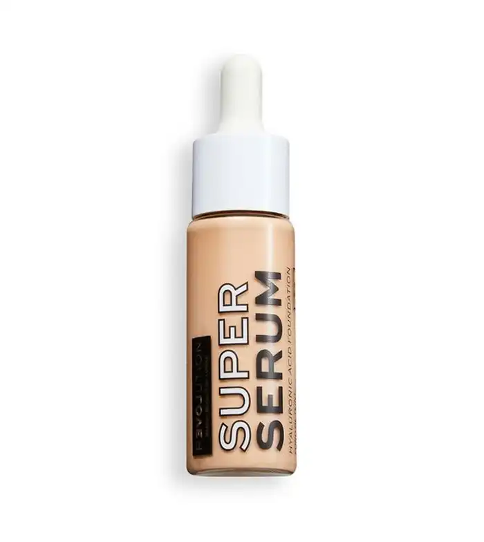 Base de maquillaje Super Serum de Revolution Relove. Ideal para crear una base ligera y sedosa. Tiene una fórmula ligera y modulable disponible en diferentes tonos para adaptarse a tu piel. Formulada con ácido hialurónico para ayudar a mantener la piel hidratada durante todo el día. Unas gotas de productos son suficientes para conseguir un acabado suave y jugoso. Modo de uso: Aplica unas gotas de producto directamente sobre la piel, en el dorso de la mano, sobre tu brocha o esponja favorita. Difumina la base de maquillaje sobre la piel del rostro hasta lograr la cobertura deseada. Usa menos gotas de producto para un acabado ligero y natural o aplica una segunda capa de producto para conseguir una cobertura media. Cruelty Free. Vegan.
