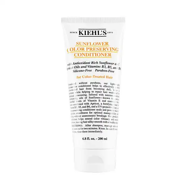 Sunflower Color Preserving Conditioner de Kiehl'sSunflower Color Preserving Conditioner, es un tratamiento capilar para cabellos teñidos y/o con mechas, que tienen tratamientos de Keratina, que han sido tratados quÃmicamente o han estado expuestos al calor. Acondicionador con aclarado. Con filtro UV. SIN PARABENE SIN SILICONA.Nuestro acondicionador especializado en cabellos teñidos, ayuda a restaurar la hidratación y reforzar el brillo, aportando más manejabilidad y para poder obtener un peinado óptimo sin enredos ni roturas.Los ingredientes principales son: Aceite de albaricoque: Provee nutrición y crea una fina capa de vitaminas y lÃpidos. Vitaminas fortalecedoras B3, B5 Y B6: Hidrata, fortalece y regenera. Aceite de Semilla de Girasol: aportan anti oxidantes que protegen y restauran.