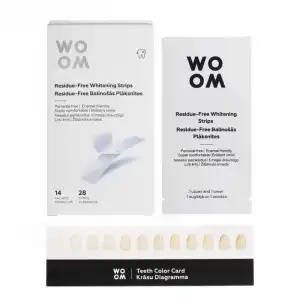 WOOM Tiras BlanqueadorasLas tiras blanqueadoras sin residuos WOOM son una de las tecnologías más avanzadas del mercado. Ofrece la experiencia de usuario más cómoda sin provocar un exceso de saliva y no deja residuos de gel que ensucien después de retirarlas.• Ultrafinas y transparentes, invisibles, puedes hablar y beber agua libremente mientras las usas.• Súper cómodas, no generan exceso de saliva.• Tecnología antideslizante, se ajustan a los dientes firmemente sin moverse.• Tecnología sin residuos, no necesita enjuagar, para usar en cualquier momento y en cualquier lugar.• Fórmula suave sin peróxido, segura para el esmalte.• Resultados efectivos de blanqueamiento dental, desde el primer uso y tratamiento completo en sólo 14 días.
