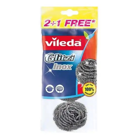 Vileda Glitzi Inox Spiral. Estropajo de espiral 100% acero inoxidable. Especial para eliminar la suciedad más incrustada. Es ideal para barbacoas, parrillas y utensilios con grasa difícil de eliminar.